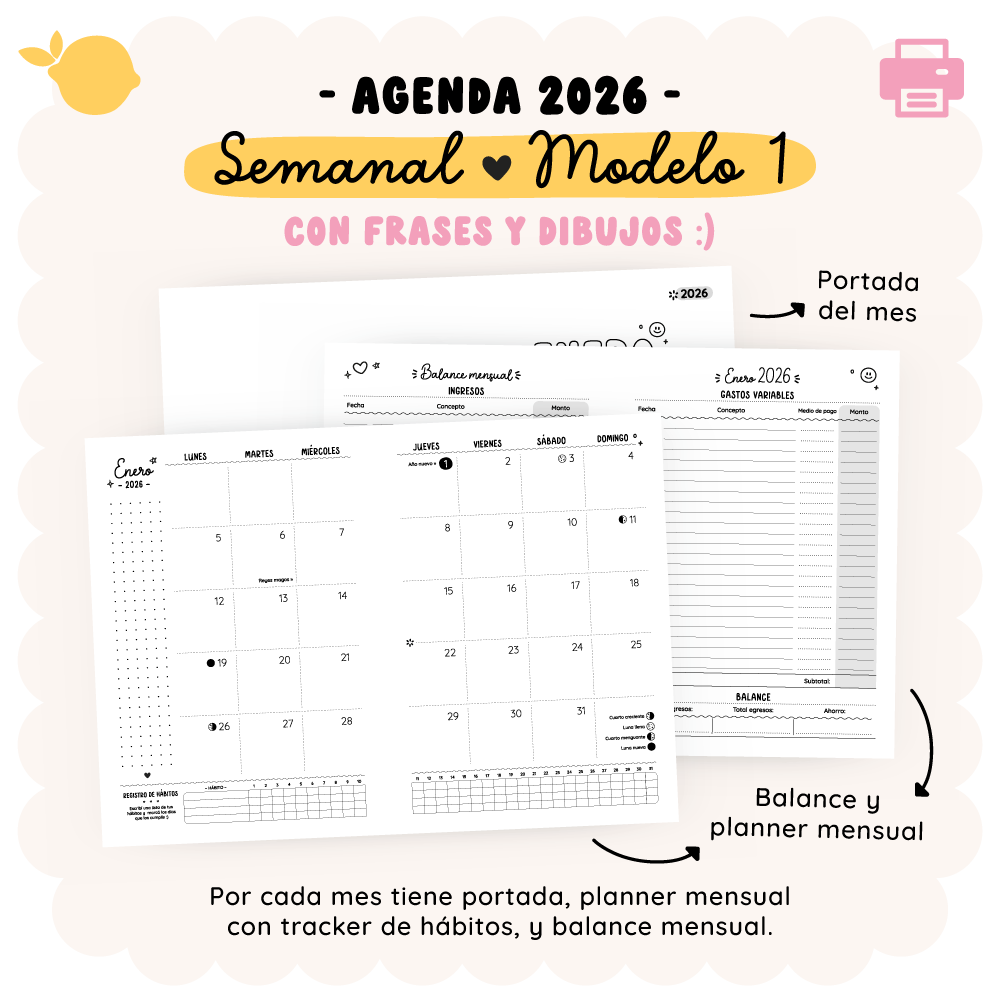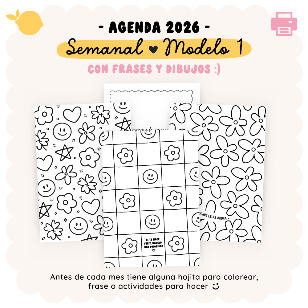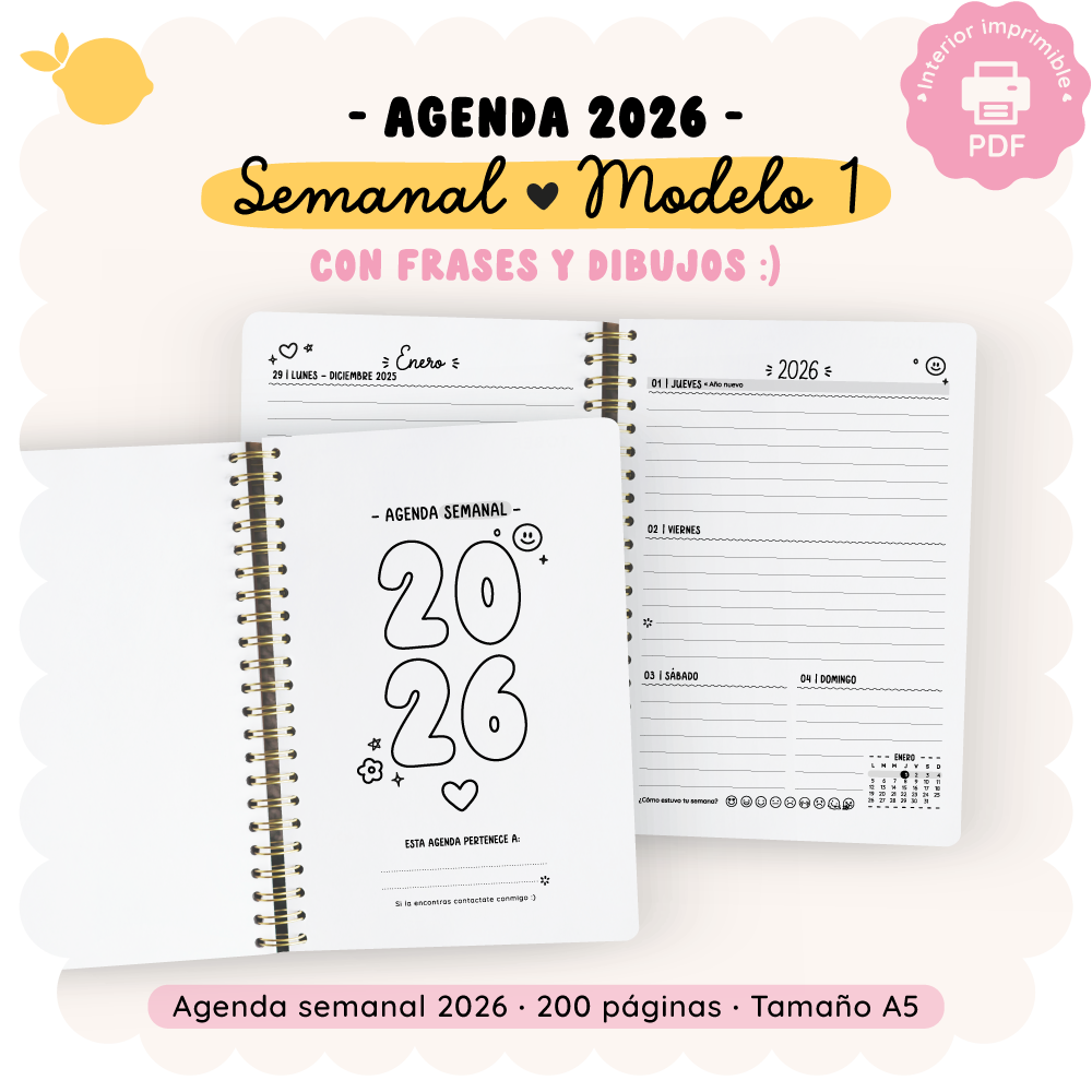 Agenda 2026 – Semanal – Modelo 1 – Con dibujos y frases – Sin renglones – Sin feriados: