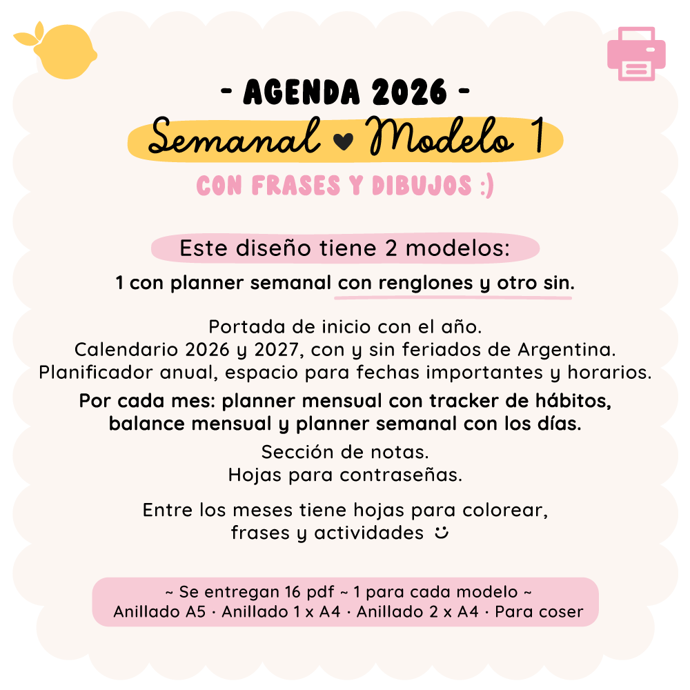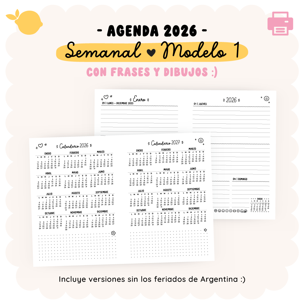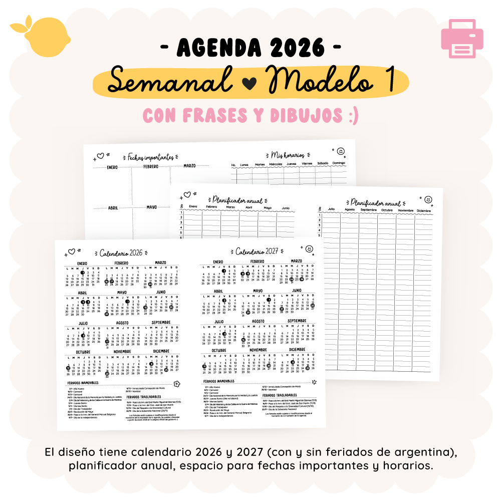 Agenda 2026 – Semanal – Modelo 1 – Con dibujos y frases – Con renglones – Con feriados de Argentina :