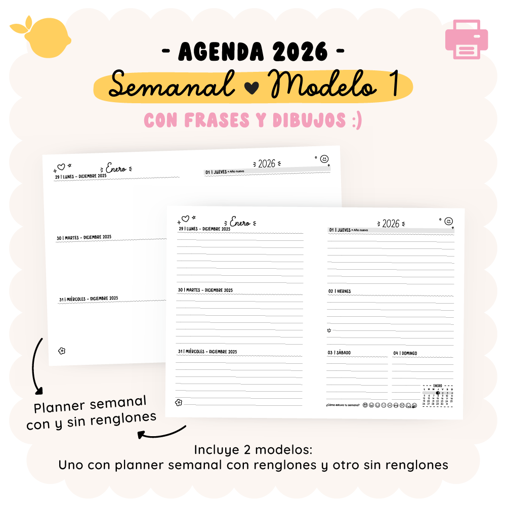 Agenda 2026 – Semanal – Modelo 1 – Con dibujos y frases – Con renglones – Sin feriados: