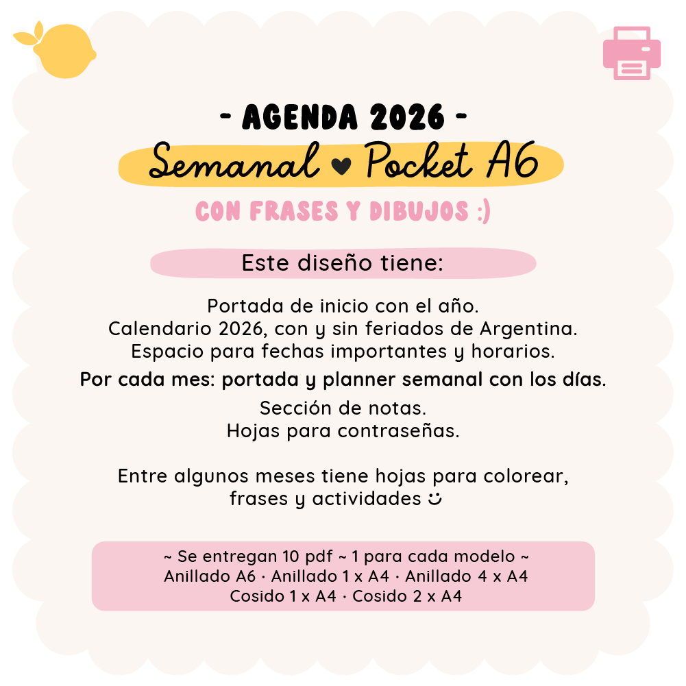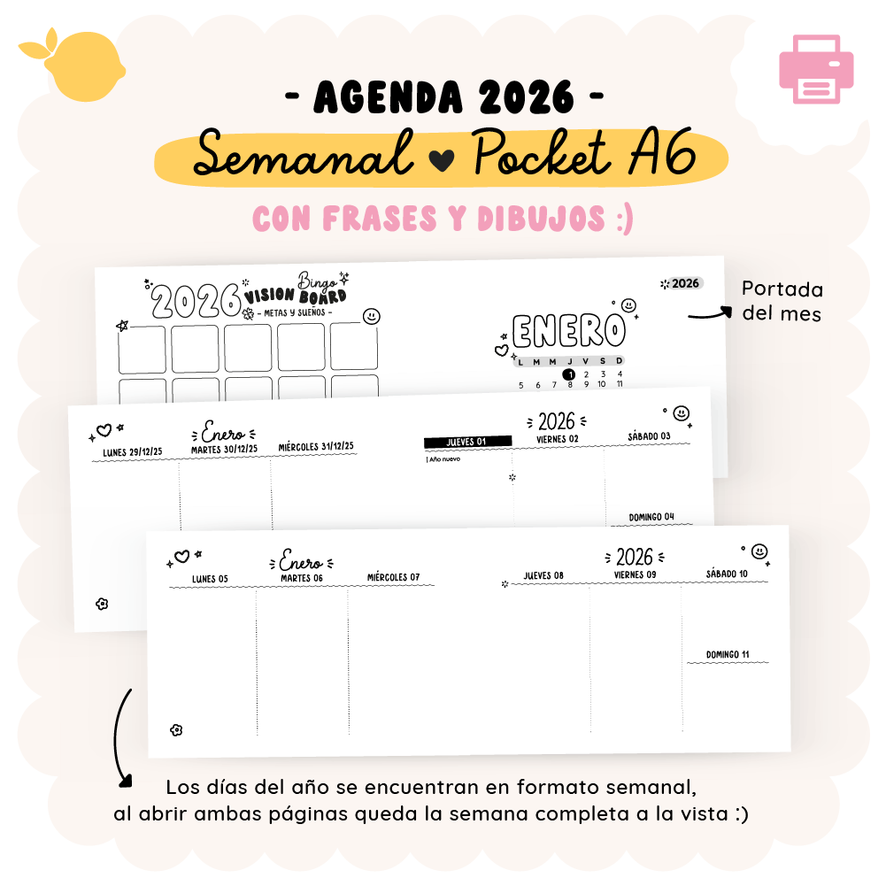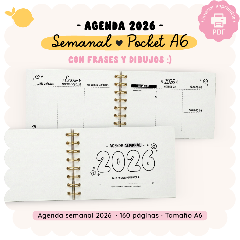 Diseño interior para imprimir y armar agendas semanales pocket 2026 🌟 con frases e ilustraciones