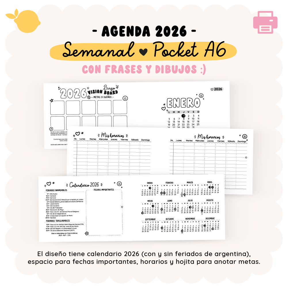 Agenda 2026 – Semanal – Pocket A6 – Con frases e ilustraciones – Con feriados de Argentina 🇦🇷: