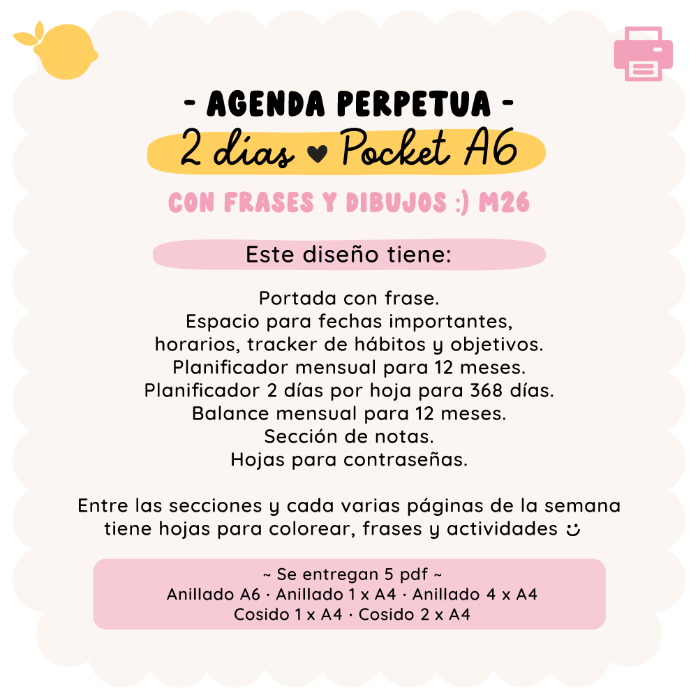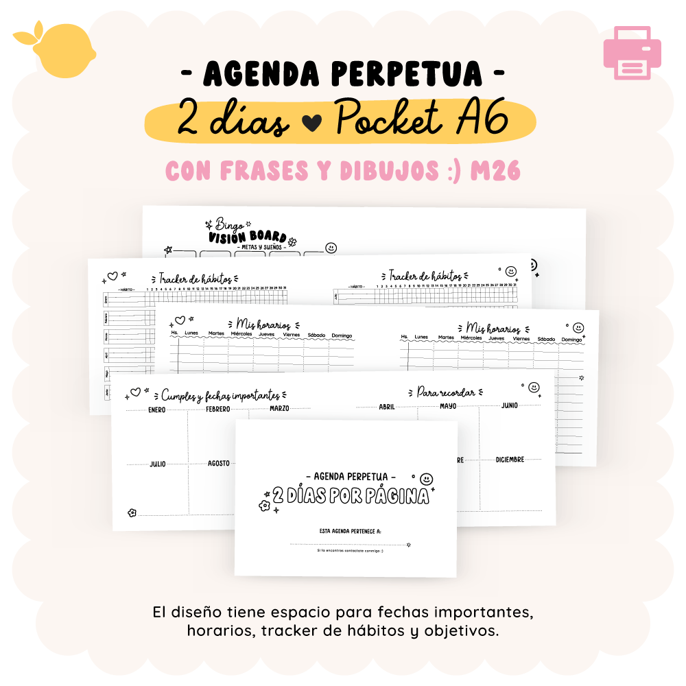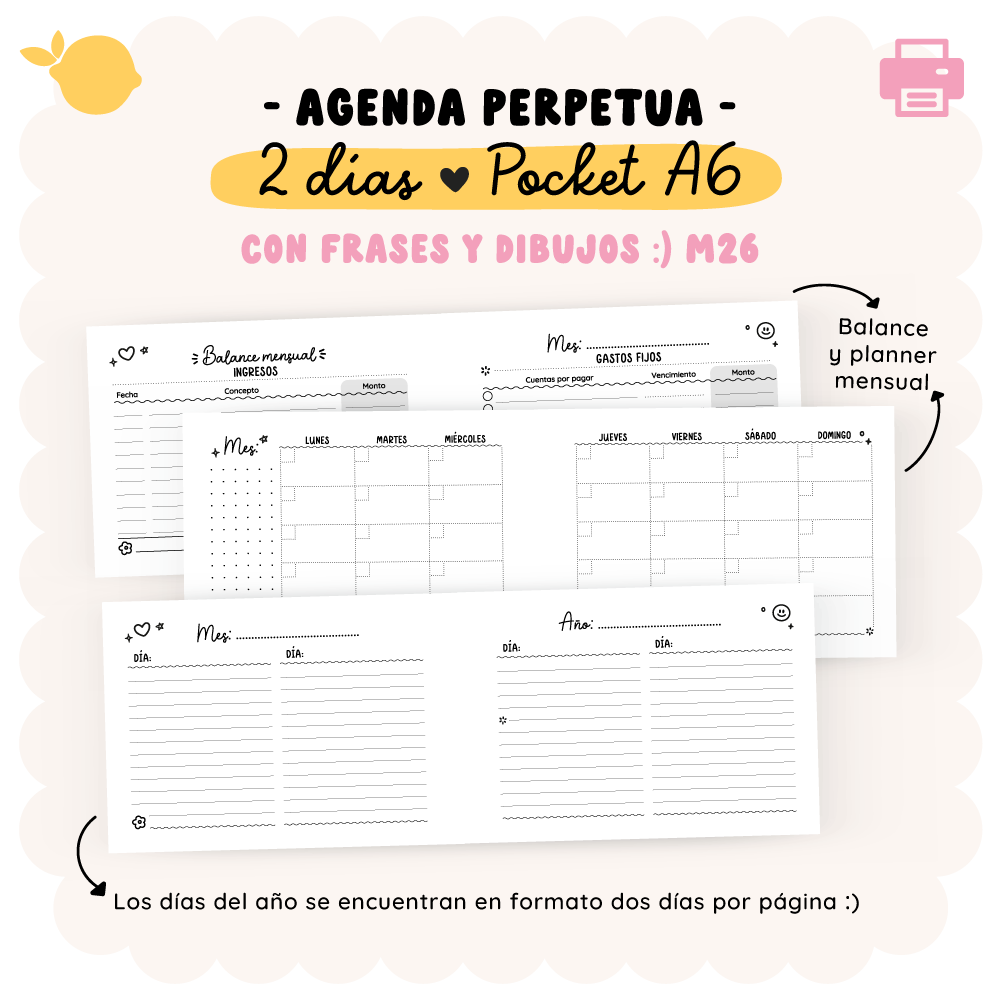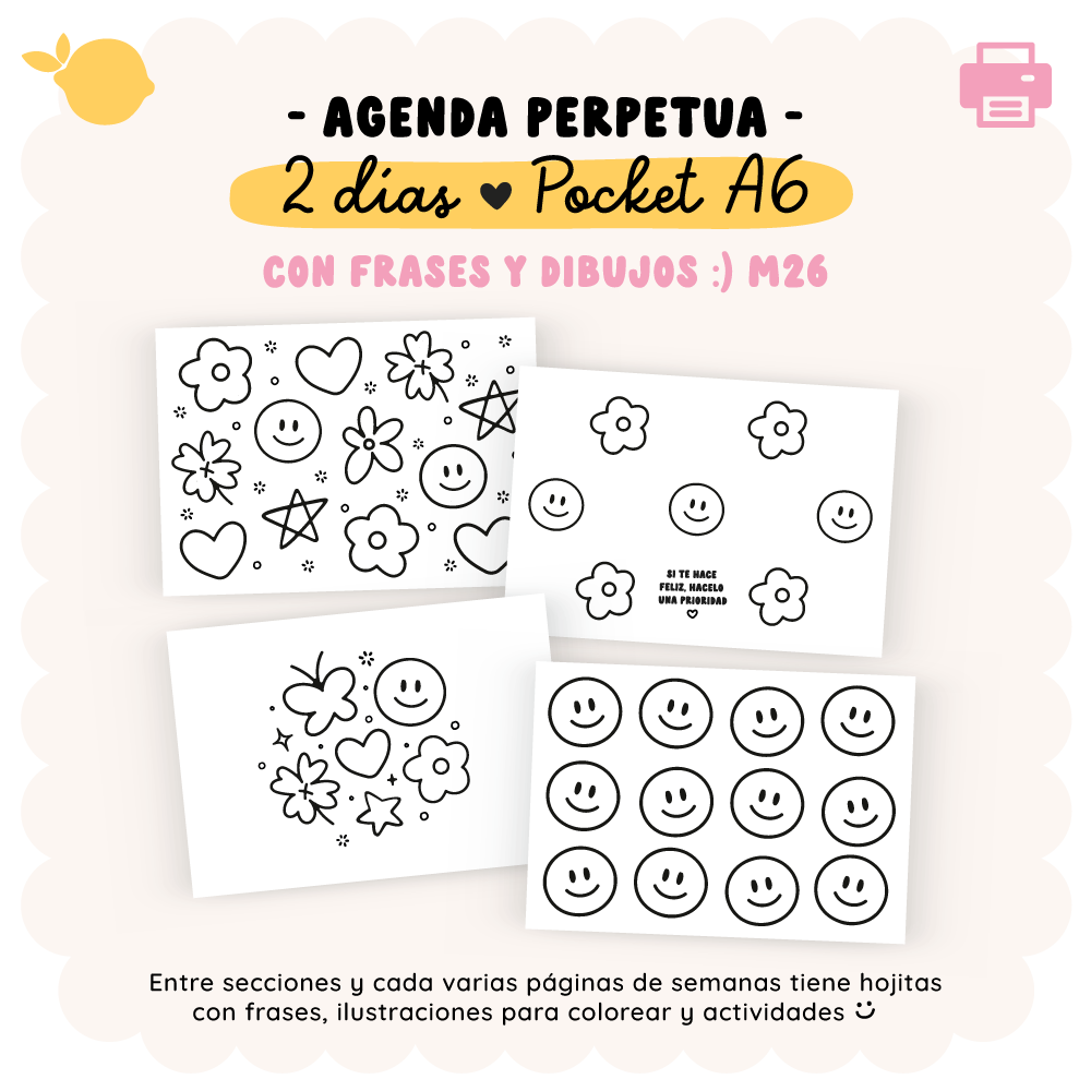 Agenda perpetua – 2 días por página – Pocket A6 – Con frases e ilustraciones M26