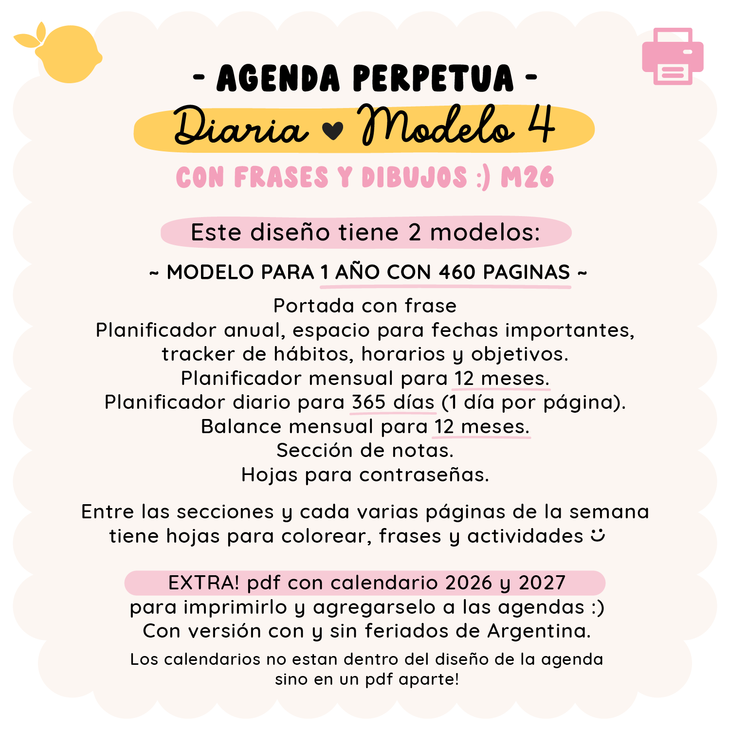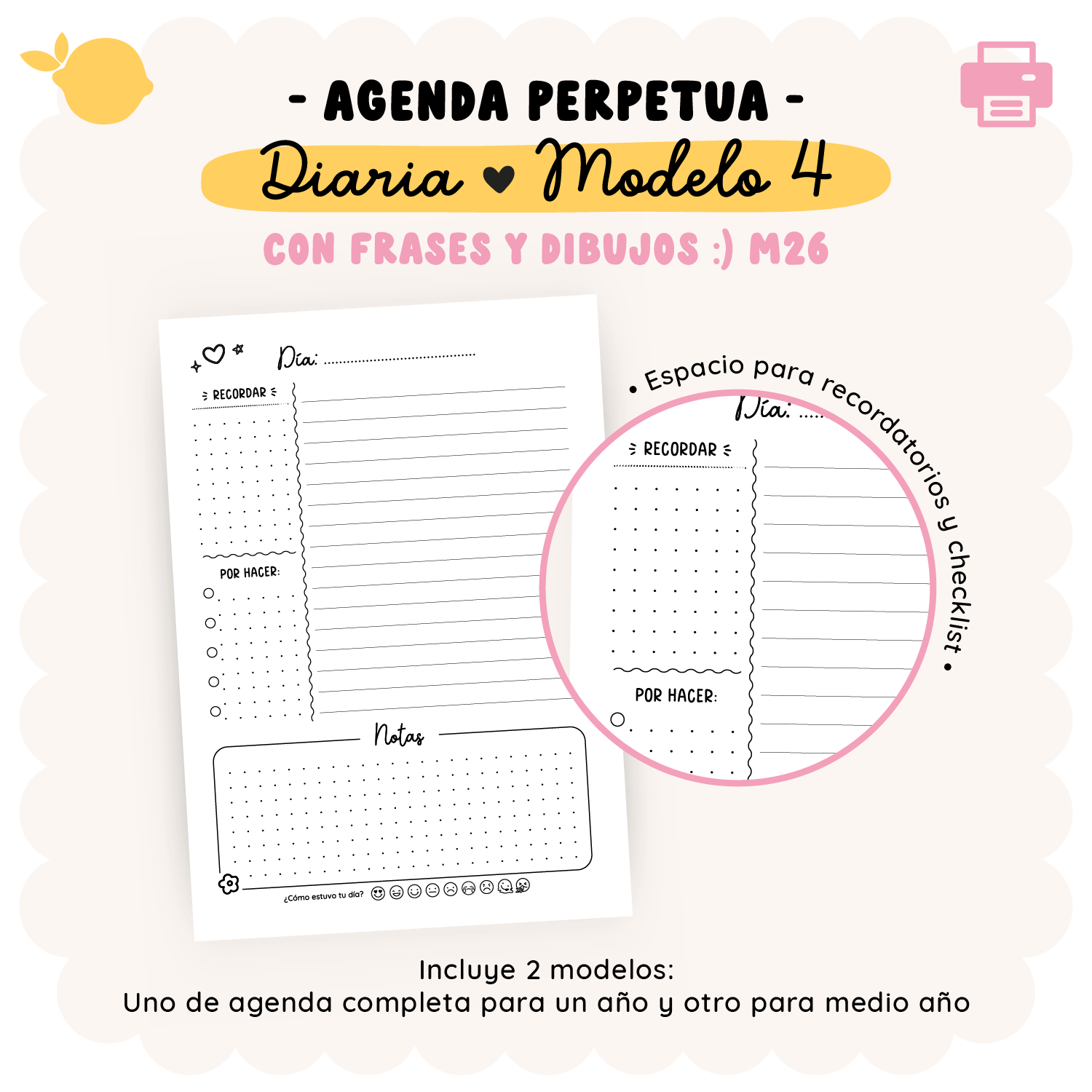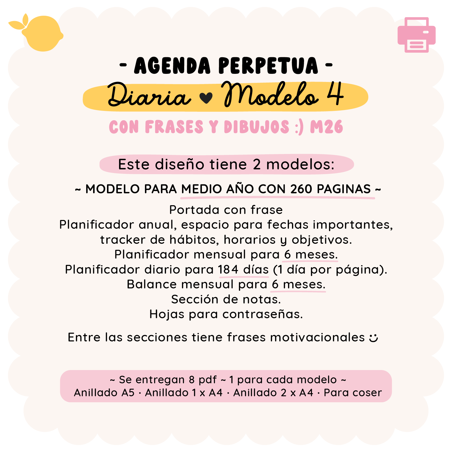 Este diseño viene armado en dos opciones, está la agenda perpetua diaria para un año que tiene muchas páginas y la misma agenda pero acomodada para medio año para que no quede una agenda tan grande, así usas el que prefieras 🙂
