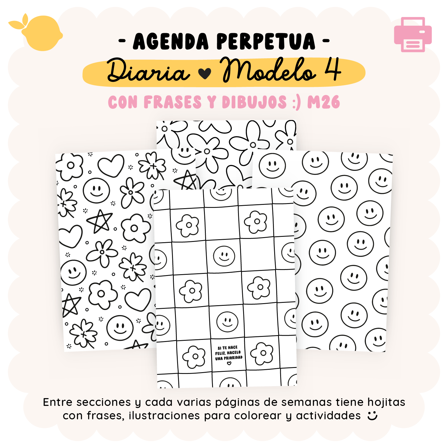 Diseño interior para imprimir y armar agendas perpetuas (sin fecha en los días) con frases e ilustraciones 🌟