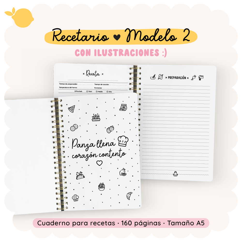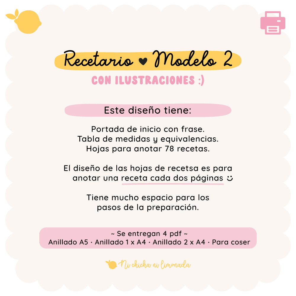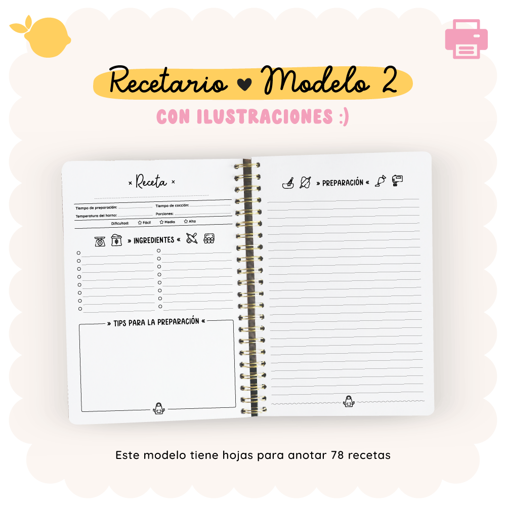 – Tamaño A4 con 2 recetarios x hoja (lo imprimis, dividis a la mitad y te quedan dos agendas)