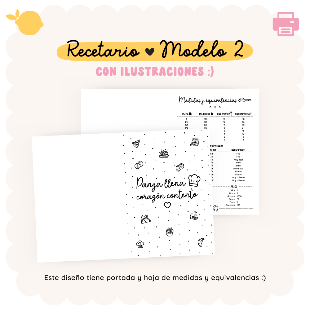 Este diseño tiene portada, página de medidas y equivalencias y paginas para 78 recetas. Una receta cada dos paginas 🙂