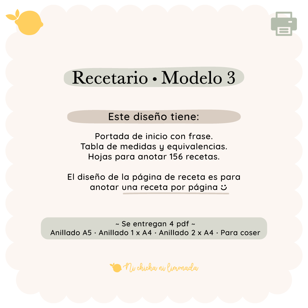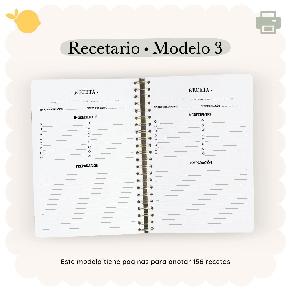– Tamaño A4 con 2 recetarios x hoja (lo imprimis, dividis a la mitad y te quedan dos agendas)