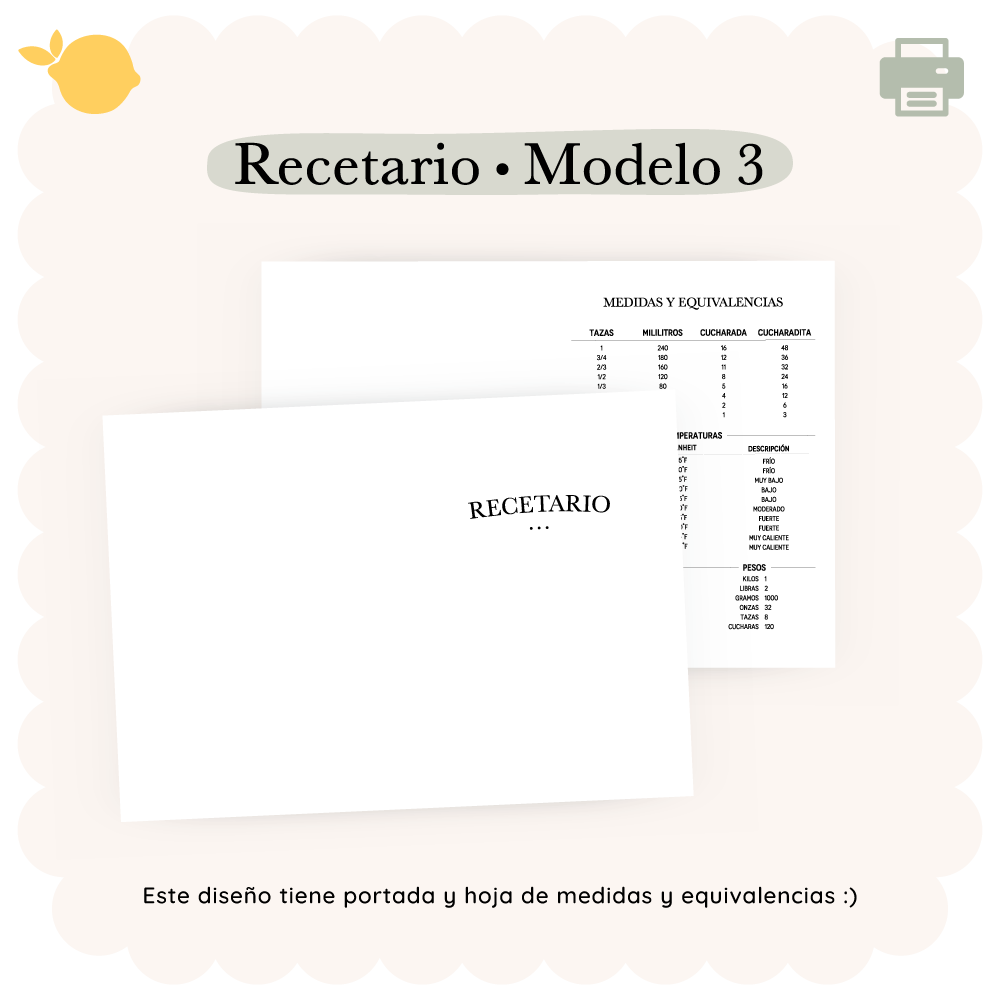 Este diseño tiene portada, página de medidas y equivalencias y paginas para 156 recetas. Una receta por pagina 🙂